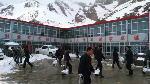 2016年3月21日青海共和縣青海銅鑫礦業(yè)有限公司礦區(qū)迎來了自春節(jié)以來的第一場大雪,前幾這里還太陽高照,天氣晴朗,與此同時(shí)洛陽陽光明媚,鳥語花香,現(xiàn)在青海銅鑫礦區(qū)則被厚厚的白雪覆蓋,呈現(xiàn)出另一番別樣的景像。青海分公司員工也一起參加礦山工作區(qū)的除雪工作,個(gè)個(gè)干得熱火朝天,一會(huì)兒大院里的雪就被清理完畢。