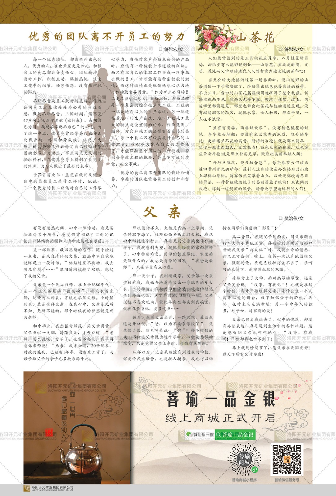 洛陽開元礦業(yè)集團(tuán)有限公司簡(jiǎn)介洛陽開元礦業(yè)集團(tuán)有限公司,始成立于2006年,位于洛陽市開元大道269號(hào)。集團(tuán)旗下共有五余家全資子公司,業(yè)務(wù)涉及有色金屬礦山開發(fā)、礦產(chǎn)品購銷與進(jìn)出口貿(mào)易、房地產(chǎn)開發(fā)、文化藝術(shù)、企業(yè)管理與咨詢、資本投資等多個(gè)領(lǐng)域。民建河南省委委員、民建河南省委企業(yè)委副主任、民建洛陽市委委員、企業(yè)委主任、洛陽民建企業(yè)家協(xié)會(huì)會(huì)長(zhǎng)許明月是公司創(chuàng)始人,現(xiàn)任洛陽開元礦業(yè)集團(tuán)有限公司董事長(zhǎng)。在礦業(yè)領(lǐng)域,洛陽開元礦業(yè)集團(tuán)擁有多家實(shí)力雄厚的子公司:貴州開元礦業(yè)有限公司探、采礦權(quán)面積共11.33平方公里;興??h銅鑫礦業(yè)有限公司探礦權(quán)面積8.76平方公里,礦山資源潛力巨大;2021年,開元集團(tuán)與盧氏中科礦業(yè)有限公司開展戰(zhàn)略合作。盧氏中科礦業(yè)有限公司專注于有色金屬的浮選、加工和銷售,擁有強(qiáng)大的技術(shù)支撐平臺(tái),是集探、采、選、冶、研為一體的中大型綜合礦業(yè)企業(yè)。目前,盧氏中科王家河1000噸選礦廠已成功投產(chǎn),雙河金礦、柳關(guān)欒盧鉛鋅礦相繼順利開工,樓房銀礦與圪老灣鉛鋅礦的深部探礦重大突破,標(biāo)志著礦山版圖取得重大進(jìn)展,為開元集團(tuán)后續(xù)發(fā)展奠定了堅(jiān)實(shí)基礎(chǔ)。在文化傳媒領(lǐng)域,洛陽市明月美術(shù)館通過豐富多樣的藝術(shù)展覽、學(xué)術(shù)研討和公共教育活動(dòng),努力打造一個(gè)集展覽、交流、教育、研究為一體的綜合性藝術(shù)平臺(tái)。此外,在金融投資領(lǐng)域,開元集團(tuán)旗下的北京明峰資本管理有限公司專注于投資具有高增長(zhǎng)潛力的優(yōu)秀企業(yè),特別是高科技、新能源、環(huán)保等新興產(chǎn)業(yè),為客戶提供個(gè)性化的資產(chǎn)配置服務(wù)。在做好企業(yè)經(jīng)營的同時(shí),開元集團(tuán)始終不忘企業(yè)的社會(huì)責(zé)任和家國情懷,以突出的愛心公益事跡,開展了一系列公益慈善活動(dòng):“民建林”公益事業(yè)通過“思源基金”“幫幫公益”線上公益平臺(tái),與眾多愛心人士籌措資金20余萬元;資助541名貧困大學(xué)生共計(jì)270余萬元,推進(jìn)“數(shù)字助力——河南AI人才培養(yǎng)”;捐款10萬元,馳援京津冀、黑龍江洪水地質(zhì)災(zāi)害……公司于2017年底被洛陽市慈善總會(huì)評(píng)為“洛陽慈善風(fēng)云榜——十大愛心集體”。洛陽開元礦業(yè)集團(tuán)有限公司秉承持續(xù)發(fā)展理念,憑借多年來良好的企業(yè)信譽(yù)與經(jīng)營業(yè)績(jī),與全國多家企業(yè)建立了良好合作關(guān)系,受到社會(huì)各界的一致好評(píng),多次榮獲“納稅標(biāo)兵”“先進(jìn)企業(yè)”“招商引資模范企業(yè)”等榮譽(yù)稱號(hào)?;赝麃頃r(shí)路,開元人勠力同心,以“闖”的精神和“創(chuàng)”的勁頭,一路披荊斬棘,踏過千山萬水;展望新未來,開元人凝心聚力,不執(zhí)于“舊”,無畏于“新”,秉承“勇于跨越,追求卓越”的企業(yè)精神,乘著國家高質(zhì)量發(fā)展新征程的東風(fēng),跨過高山,越過大海,向著集團(tuán)多元化、國際化的目標(biāo),逐夢(mèng)遠(yuǎn)航,跨越前行!