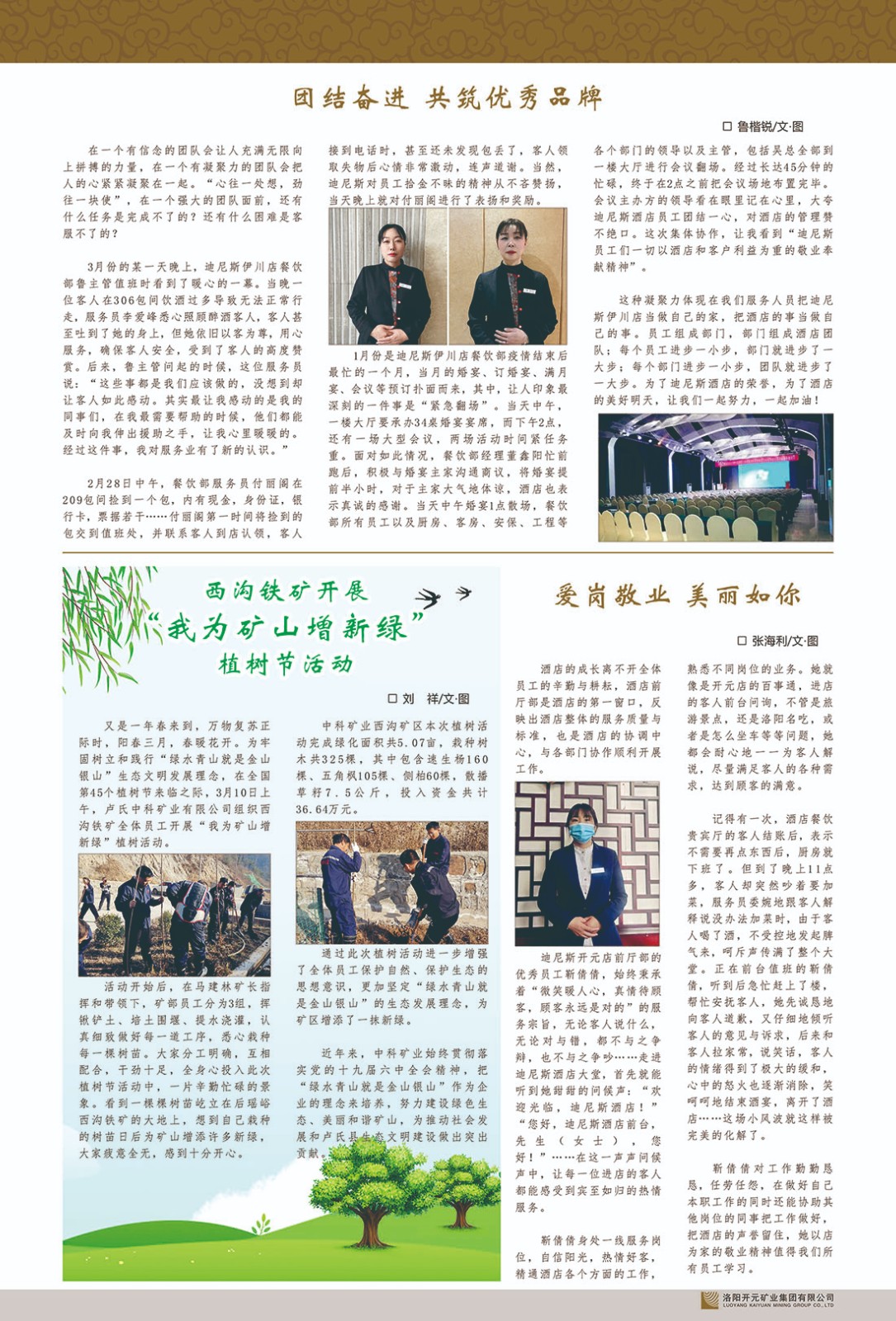 洛陽開元礦業(yè)集團(tuán)有限公司簡介洛陽開元礦業(yè)集團(tuán)有限公司,始成立于2006年,位于洛陽市開元大道269號。集團(tuán)旗下共有五余家全資子公司,業(yè)務(wù)涉及有色金屬礦山開發(fā)、礦產(chǎn)品購銷與進(jìn)出口貿(mào)易、房地產(chǎn)開發(fā)、文化藝術(shù)、企業(yè)管理與咨詢、資本投資等多個領(lǐng)域。民建河南省委委員、民建河南省委企業(yè)委副主任、民建洛陽市委委員、企業(yè)委主任、洛陽民建企業(yè)家協(xié)會會長許明月是公司創(chuàng)始人,現(xiàn)任洛陽開元礦業(yè)集團(tuán)有限公司董事長。在礦業(yè)領(lǐng)域,洛陽開元礦業(yè)集團(tuán)擁有多家實(shí)力雄厚的子公司:貴州開元礦業(yè)有限公司探、采礦權(quán)面積共11.33平方公里;興??h銅鑫礦業(yè)有限公司探礦權(quán)面積8.76平方公里,礦山資源潛力巨大;2021年,開元集團(tuán)與盧氏中科礦業(yè)有限公司開展戰(zhàn)略合作。盧氏中科礦業(yè)有限公司專注于有色金屬的浮選、加工和銷售,擁有強(qiáng)大的技術(shù)支撐平臺,是集探、采、選、冶、研為一體的中大型綜合礦業(yè)企業(yè)。目前,盧氏中科王家河1000噸選礦廠已成功投產(chǎn),雙河金礦、柳關(guān)欒盧鉛鋅礦相繼順利開工,樓房銀礦與圪老灣鉛鋅礦的深部探礦重大突破,標(biāo)志著礦山版圖取得重大進(jìn)展,為開元集團(tuán)后續(xù)發(fā)展奠定了堅(jiān)實(shí)基礎(chǔ)。在文化傳媒領(lǐng)域,洛陽市明月美術(shù)館通過豐富多樣的藝術(shù)展覽、學(xué)術(shù)研討和公共教育活動,努力打造一個集展覽、交流、教育、研究為一體的綜合性藝術(shù)平臺。此外,在金融投資領(lǐng)域,開元集團(tuán)旗下的北京明峰資本管理有限公司專注于投資具有高增長潛力的優(yōu)秀企業(yè),特別是高科技、新能源、環(huán)保等新興產(chǎn)業(yè),為客戶提供個性化的資產(chǎn)配置服務(wù)。在做好企業(yè)經(jīng)營的同時,開元集團(tuán)始終不忘企業(yè)的社會責(zé)任和家國情懷,以突出的愛心公益事跡,開展了一系列公益慈善活動:“民建林”公益事業(yè)通過“思源基金”“幫幫公益”線上公益平臺,與眾多愛心人士籌措資金20余萬元;資助541名貧困大學(xué)生共計(jì)270余萬元,推進(jìn)“數(shù)字助力——河南AI人才培養(yǎng)”;捐款10萬元,馳援京津冀、黑龍江洪水地質(zhì)災(zāi)害……公司于2017年底被洛陽市慈善總會評為“洛陽慈善風(fēng)云榜——十大愛心集體”。洛陽開元礦業(yè)集團(tuán)有限公司秉承持續(xù)發(fā)展理念,憑借多年來良好的企業(yè)信譽(yù)與經(jīng)營業(yè)績,與全國多家企業(yè)建立了良好合作關(guān)系,受到社會各界的一致好評,多次榮獲“納稅標(biāo)兵”“先進(jìn)企業(yè)”“招商引資模范企業(yè)”等榮譽(yù)稱號?;赝麃頃r路,開元人勠力同心,以“闖”的精神和“創(chuàng)”的勁頭,一路披荊斬棘,踏過千山萬水;展望新未來,開元人凝心聚力,不執(zhí)于“舊”,無畏于“新”,秉承“勇于跨越,追求卓越”的企業(yè)精神,乘著國家高質(zhì)量發(fā)展新征程的東風(fēng),跨過高山,越過大海,向著集團(tuán)多元化、國際化的目標(biāo),逐夢遠(yuǎn)航,跨越前行!