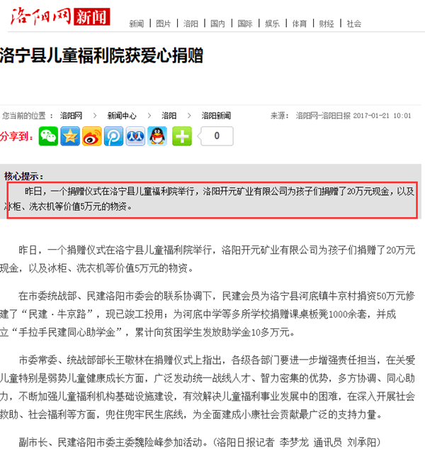 弘揚(yáng)社會(huì)正能量 愛心事業(yè)美名揚(yáng)——洛陽開元礦業(yè)集團(tuán)善舉引起國內(nèi)各大媒體高度關(guān)注