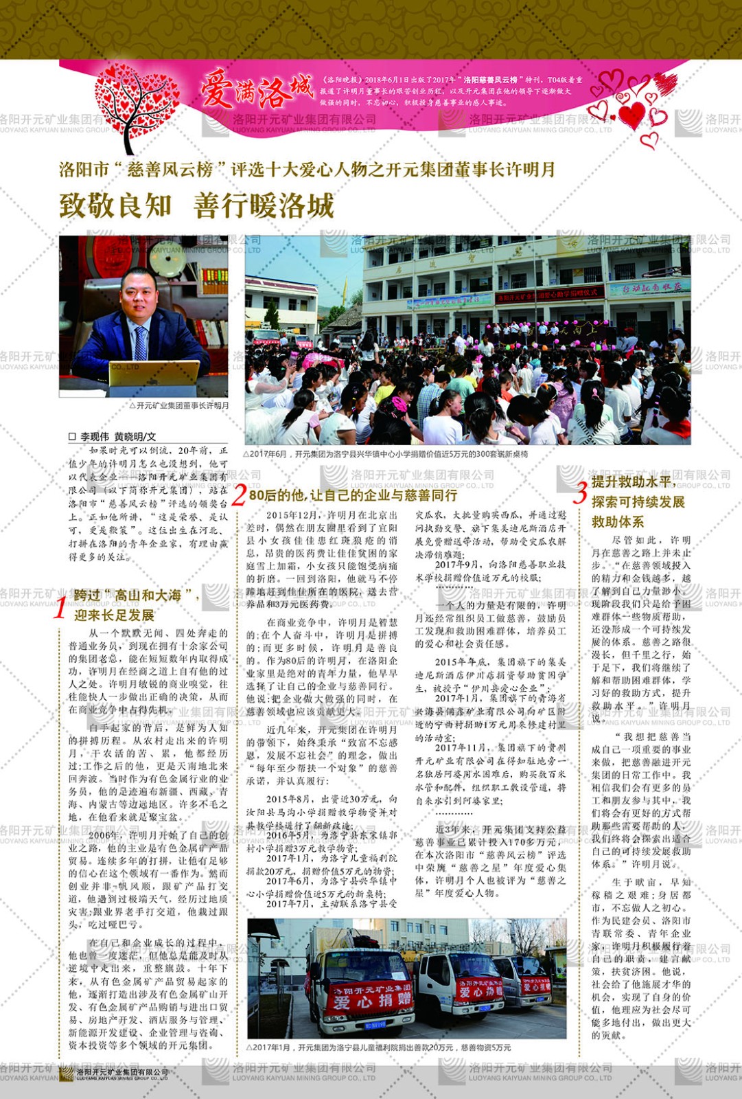 洛陽(yáng)開(kāi)元礦業(yè)集團(tuán)有限公司簡(jiǎn)介洛陽(yáng)開(kāi)元礦業(yè)集團(tuán)有限公司,始成立于2006年,位于洛陽(yáng)市開(kāi)元大道269號(hào)。集團(tuán)旗下共有五余家全資子公司,業(yè)務(wù)涉及有色金屬礦山開(kāi)發(fā)、礦產(chǎn)品購(gòu)銷(xiāo)與進(jìn)出口貿(mào)易、房地產(chǎn)開(kāi)發(fā)、文化藝術(shù)、企業(yè)管理與咨詢、資本投資等多個(gè)領(lǐng)域。民建河南省委委員、民建河南省委企業(yè)委副主任、民建洛陽(yáng)市委委員、企業(yè)委主任、洛陽(yáng)民建企業(yè)家協(xié)會(huì)會(huì)長(zhǎng)許明月是公司創(chuàng)始人,現(xiàn)任洛陽(yáng)開(kāi)元礦業(yè)集團(tuán)有限公司董事長(zhǎng)。在礦業(yè)領(lǐng)域,洛陽(yáng)開(kāi)元礦業(yè)集團(tuán)擁有多家實(shí)力雄厚的子公司:貴州開(kāi)元礦業(yè)有限公司探、采礦權(quán)面積共11.33平方公里;興??h銅鑫礦業(yè)有限公司探礦權(quán)面積8.76平方公里,礦山資源潛力巨大;2021年,開(kāi)元集團(tuán)與盧氏中科礦業(yè)有限公司開(kāi)展戰(zhàn)略合作。盧氏中科礦業(yè)有限公司專(zhuān)注于有色金屬的浮選、加工和銷(xiāo)售,擁有強(qiáng)大的技術(shù)支撐平臺(tái),是集探、采、選、冶、研為一體的中大型綜合礦業(yè)企業(yè)。目前,盧氏中科王家河1000噸選礦廠已成功投產(chǎn),雙河金礦、柳關(guān)欒盧鉛鋅礦相繼順利開(kāi)工,樓房銀礦與圪老灣鉛鋅礦的深部探礦重大突破,標(biāo)志著礦山版圖取得重大進(jìn)展,為開(kāi)元集團(tuán)后續(xù)發(fā)展奠定了堅(jiān)實(shí)基礎(chǔ)。在文化傳媒領(lǐng)域,洛陽(yáng)市明月美術(shù)館通過(guò)豐富多樣的藝術(shù)展覽、學(xué)術(shù)研討和公共教育活動(dòng),努力打造一個(gè)集展覽、交流、教育、研究為一體的綜合性藝術(shù)平臺(tái)。此外,在金融投資領(lǐng)域,開(kāi)元集團(tuán)旗下的北京明峰資本管理有限公司專(zhuān)注于投資具有高增長(zhǎng)潛力的優(yōu)秀企業(yè),特別是高科技、新能源、環(huán)保等新興產(chǎn)業(yè),為客戶提供個(gè)性化的資產(chǎn)配置服務(wù)。在做好企業(yè)經(jīng)營(yíng)的同時(shí),開(kāi)元集團(tuán)始終不忘企業(yè)的社會(huì)責(zé)任和家國(guó)情懷,以突出的愛(ài)心公益事跡,開(kāi)展了一系列公益慈善活動(dòng):“民建林”公益事業(yè)通過(guò)“思源基金”“幫幫公益”線上公益平臺(tái),與眾多愛(ài)心人士籌措資金20余萬(wàn)元;資助541名貧困大學(xué)生共計(jì)270余萬(wàn)元,推進(jìn)“數(shù)字助力——河南AI人才培養(yǎng)”;捐款10萬(wàn)元,馳援京津冀、黑龍江洪水地質(zhì)災(zāi)害……公司于2017年底被洛陽(yáng)市慈善總會(huì)評(píng)為“洛陽(yáng)慈善風(fēng)云榜——十大愛(ài)心集體”。洛陽(yáng)開(kāi)元礦業(yè)集團(tuán)有限公司秉承持續(xù)發(fā)展理念,憑借多年來(lái)良好的企業(yè)信譽(yù)與經(jīng)營(yíng)業(yè)績(jī),與全國(guó)多家企業(yè)建立了良好合作關(guān)系,受到社會(huì)各界的一致好評(píng),多次榮獲“納稅標(biāo)兵”“先進(jìn)企業(yè)”“招商引資模范企業(yè)”等榮譽(yù)稱號(hào)。回望來(lái)時(shí)路,開(kāi)元人勠力同心,以“闖”的精神和“創(chuàng)”的勁頭,一路披荊斬棘,踏過(guò)千山萬(wàn)水;展望新未來(lái),開(kāi)元人凝心聚力,不執(zhí)于“舊”,無(wú)畏于“新”,秉承“勇于跨越,追求卓越”的企業(yè)精神,乘著國(guó)家高質(zhì)量發(fā)展新征程的東風(fēng),跨過(guò)高山,越過(guò)大海,向著集團(tuán)多元化、國(guó)際化的目標(biāo),逐夢(mèng)遠(yuǎn)航,跨越前行!