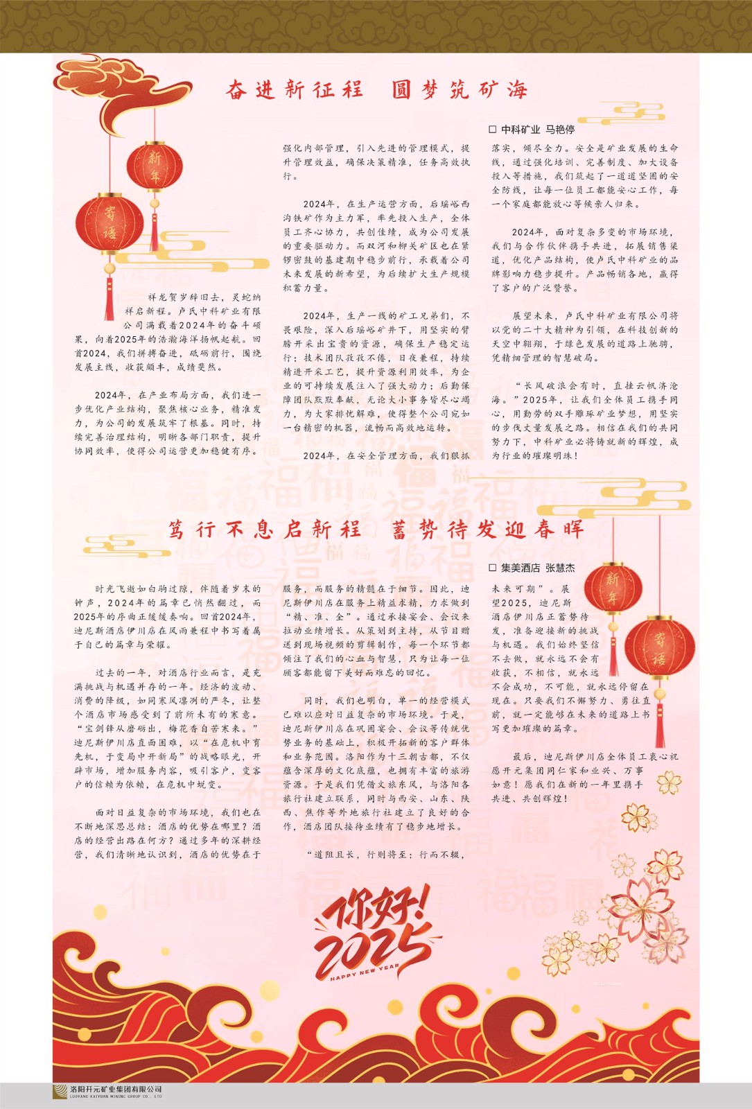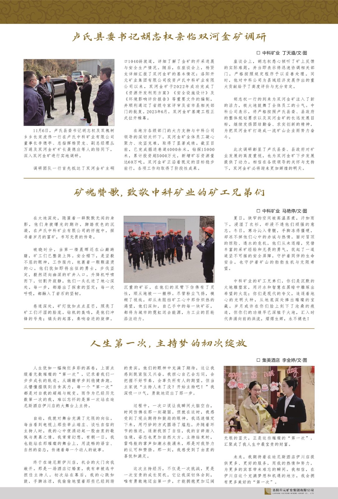 洛陽開元礦業(yè)集團(tuán)有限公司簡介洛陽開元礦業(yè)集團(tuán)有限公司,始成立于2006年,位于洛陽市開元大道269號。集團(tuán)旗下共有五余家全資子公司,業(yè)務(wù)涉及有色金屬礦山開發(fā)、礦產(chǎn)品購銷與進(jìn)出口貿(mào)易、房地產(chǎn)開發(fā)、文化藝術(shù)、企業(yè)管理與咨詢、資本投資等多個領(lǐng)域。民建河南省委委員、民建河南省委企業(yè)委副主任、民建洛陽市委委員、企業(yè)委主任、洛陽民建企業(yè)家協(xié)會會長許明月是公司創(chuàng)始人,現(xiàn)任洛陽開元礦業(yè)集團(tuán)有限公司董事長。在礦業(yè)領(lǐng)域,洛陽開元礦業(yè)集團(tuán)擁有多家實(shí)力雄厚的子公司:貴州開元礦業(yè)有限公司探、采礦權(quán)面積共11.33平方公里;興??h銅鑫礦業(yè)有限公司探礦權(quán)面積8.76平方公里,礦山資源潛力巨大;2021年,開元集團(tuán)與盧氏中科礦業(yè)有限公司開展戰(zhàn)略合作。盧氏中科礦業(yè)有限公司專注于有色金屬的浮選、加工和銷售,擁有強(qiáng)大的技術(shù)支撐平臺,是集探、采、選、冶、研為一體的中大型綜合礦業(yè)企業(yè)。目前,盧氏中科王家河1000噸選礦廠已成功投產(chǎn),雙河金礦、柳關(guān)欒盧鉛鋅礦相繼順利開工,樓房銀礦與圪老灣鉛鋅礦的深部探礦重大突破,標(biāo)志著礦山版圖取得重大進(jìn)展,為開元集團(tuán)后續(xù)發(fā)展奠定了堅(jiān)實(shí)基礎(chǔ)。在文化傳媒領(lǐng)域,洛陽市明月美術(shù)館通過豐富多樣的藝術(shù)展覽、學(xué)術(shù)研討和公共教育活動,努力打造一個集展覽、交流、教育、研究為一體的綜合性藝術(shù)平臺。此外,在金融投資領(lǐng)域,開元集團(tuán)旗下的北京明峰資本管理有限公司專注于投資具有高增長潛力的優(yōu)秀企業(yè),特別是高科技、新能源、環(huán)保等新興產(chǎn)業(yè),為客戶提供個性化的資產(chǎn)配置服務(wù)。在做好企業(yè)經(jīng)營的同時,開元集團(tuán)始終不忘企業(yè)的社會責(zé)任和家國情懷,以突出的愛心公益事跡,開展了一系列公益慈善活動:“民建林”公益事業(yè)通過“思源基金”“幫幫公益”線上公益平臺,與眾多愛心人士籌措資金20余萬元;資助541名貧困大學(xué)生共計(jì)270余萬元,推進(jìn)“數(shù)字助力——河南AI人才培養(yǎng)”;捐款10萬元,馳援京津冀、黑龍江洪水地質(zhì)災(zāi)害……公司于2017年底被洛陽市慈善總會評為“洛陽慈善風(fēng)云榜——十大愛心集體”。洛陽開元礦業(yè)集團(tuán)有限公司秉承持續(xù)發(fā)展理念,憑借多年來良好的企業(yè)信譽(yù)與經(jīng)營業(yè)績,與全國多家企業(yè)建立了良好合作關(guān)系,受到社會各界的一致好評,多次榮獲“納稅標(biāo)兵”“先進(jìn)企業(yè)”“招商引資模范企業(yè)”等榮譽(yù)稱號?;赝麃頃r路,開元人勠力同心,以“闖”的精神和“創(chuàng)”的勁頭,一路披荊斬棘,踏過千山萬水;展望新未來,開元人凝心聚力,不執(zhí)于“舊”,無畏于“新”,秉承“勇于跨越,追求卓越”的企業(yè)精神,乘著國家高質(zhì)量發(fā)展新征程的東風(fēng),跨過高山,越過大海,向著集團(tuán)多元化、國際化的目標(biāo),逐夢遠(yuǎn)航,跨越前行!
